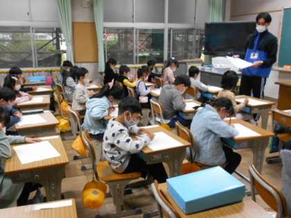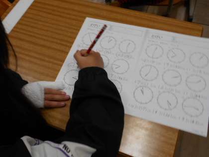 長い針や短い針のさすメモリに気を付けて,「何時何分」かを考えます。みんなで答え合わせをしています。