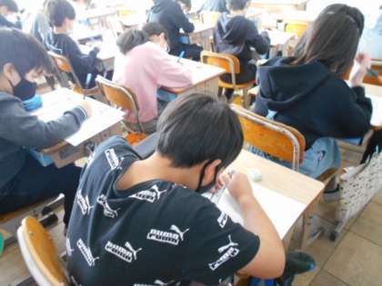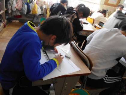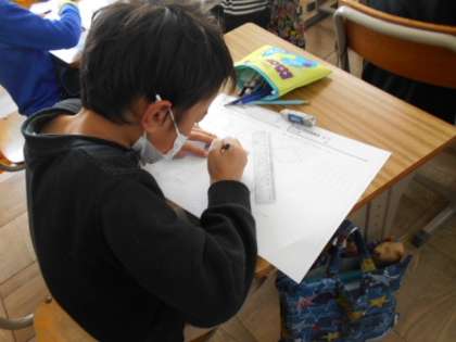 四角形の学習プリントをしています。辺の長さや角の大きさをもとに作図をします。