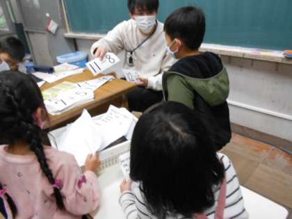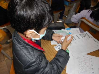 計算カードに挑戦しています。順番に先生にチェックを受けます。待っている間は自分で練習です。