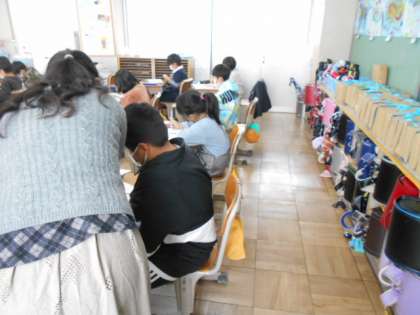 自分でお話を作りました。登場人物や出来事の順番を考えて文章を書きます。絵本にします。