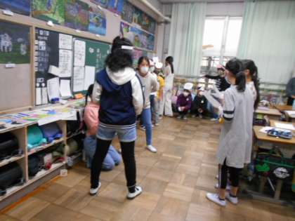 5年 林間学校に向けて 公開日 2021/12/17 更新日 2021/12/17 5年生 12月22日に林間学校に行く5年生。キャンプファイアーでの出し物を練習しています。チームでの協力が見られます。