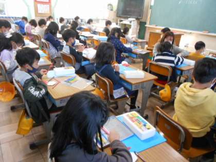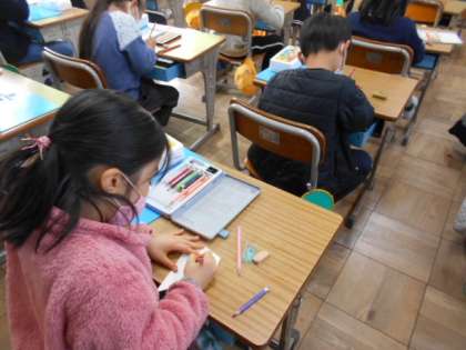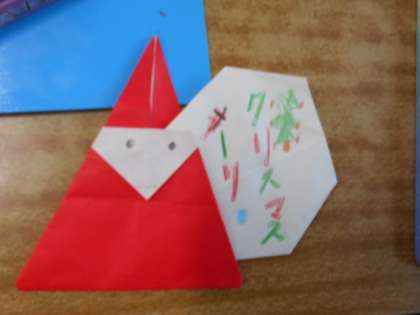 折り紙でサンタクロースの飾りを作っています。とても上手です。冬休みが待ち遠しいですね。