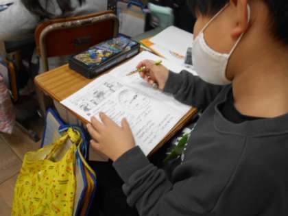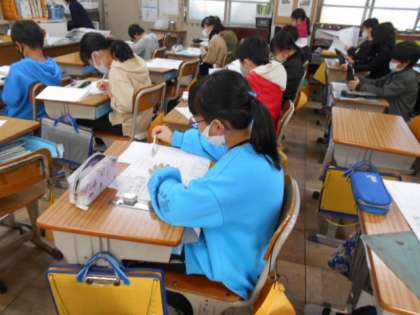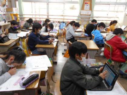 分数や重さなどの復習プリントをしています。終わった人は,児童用パソコンを使って学習しています。