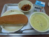 4月24日(金)の献立は・コッペパン・牛乳・グリーンポタージュ・ハンバーグ野菜ソ...