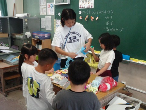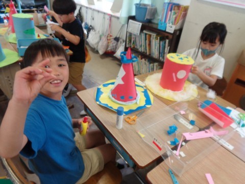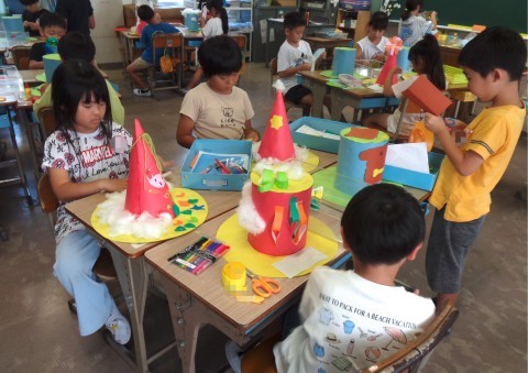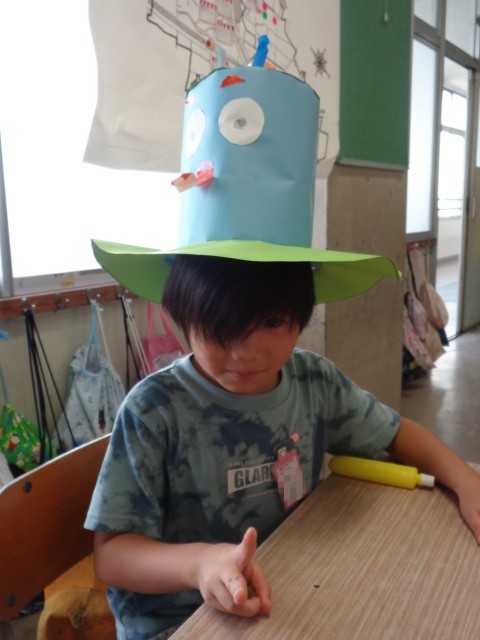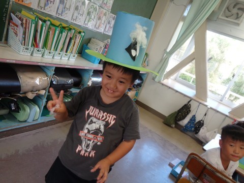 図工の授業でぼうしを作っています。