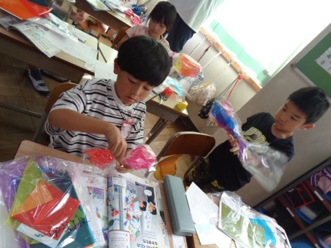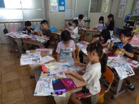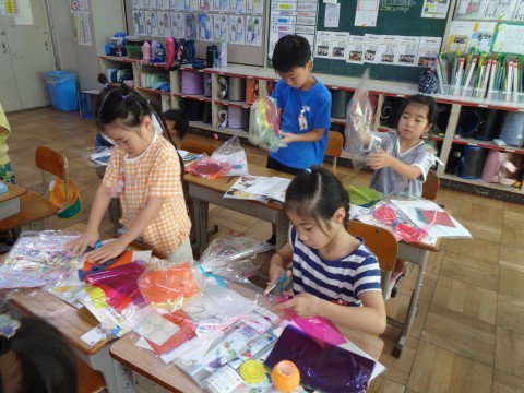 色とりどりのカラーセロファンを使って、人形を作っています。