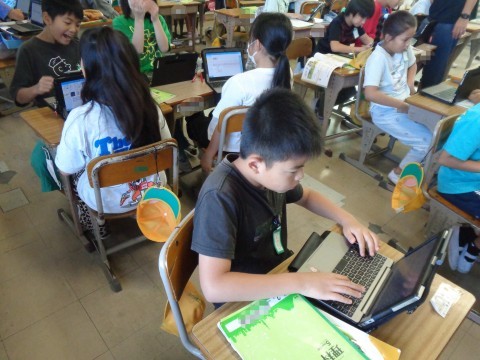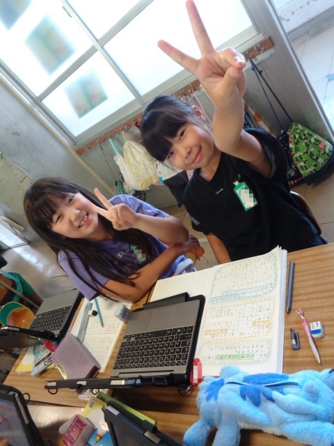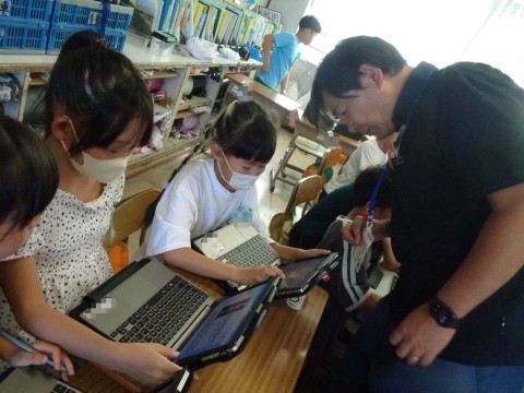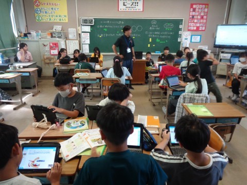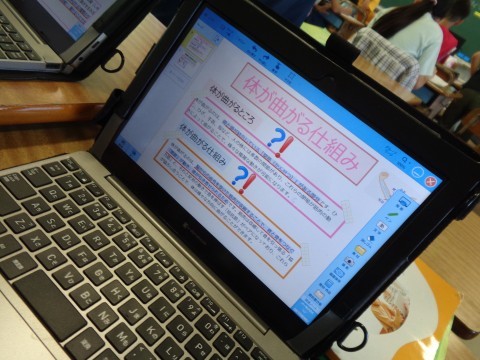 今日は、課題について、タブレットや人体模型を使いながら自分たちで調べ、学習したことをまとめる活動になっています。