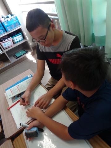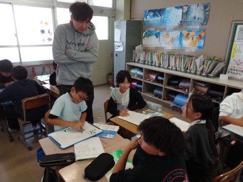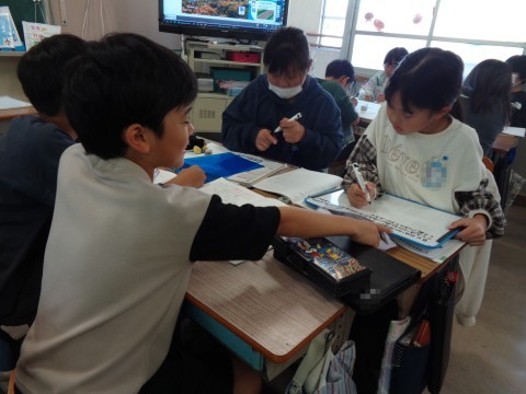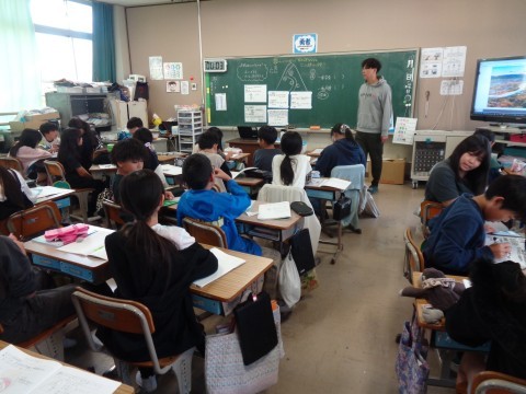 理科の授業で、蛇行した川の周辺で一番安全な場所と一番危険な場所について、理由とともに話し合っています。