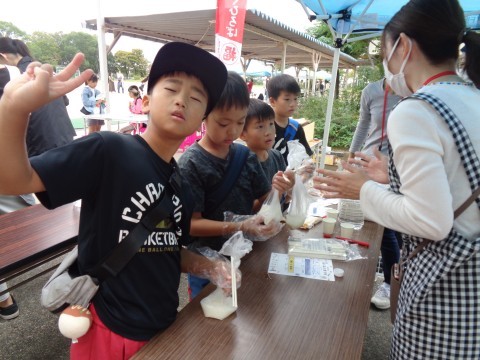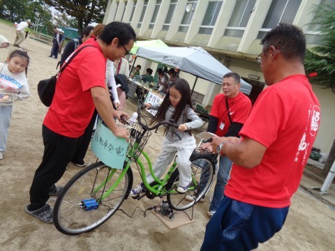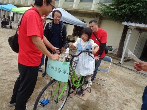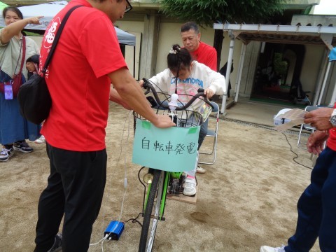 段ボールベッドの組み立て体験や自転車による発電体験もありました。