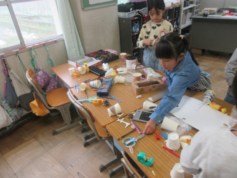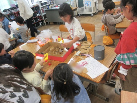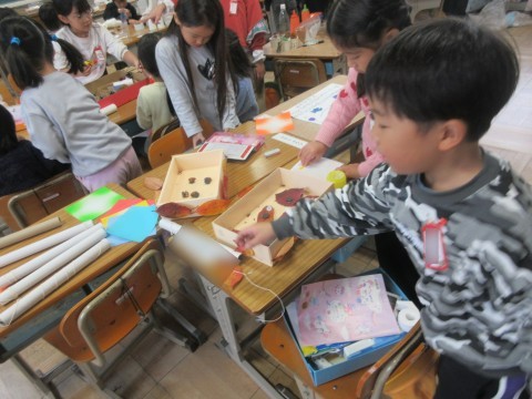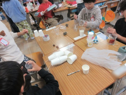 ドングリや落ち葉を使って楽しそうなおもちゃを作っています。
