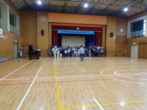 5年生の子どもたちが、体育館で参観の準備をしています。
