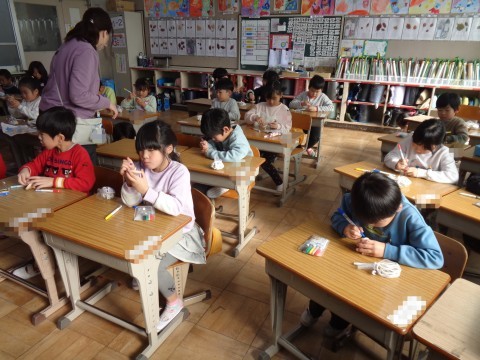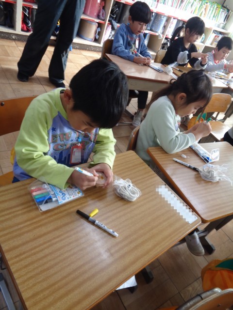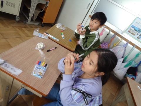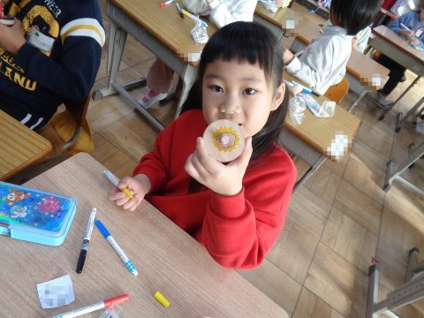 1年生のこどもたちが、こまに色を塗って、自分だけのこまを作っています。