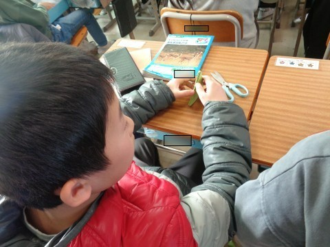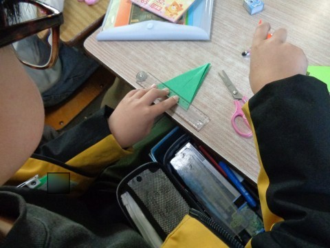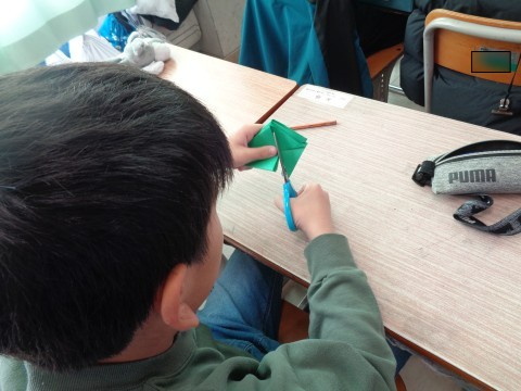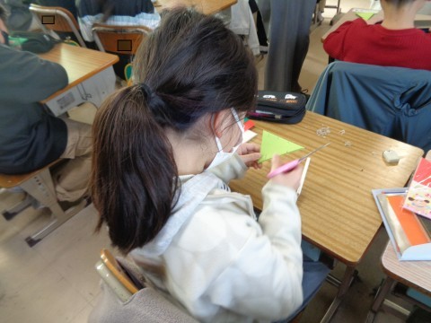 はさみで慎重に切り込みを入れながら,制作を進めていました。 出来栄えがきれいになるように,先生の話も聞き洩らさないように集中しています。