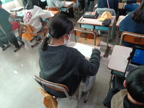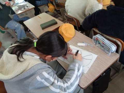はさみや通学帽子を細かいところまで確認し,絵に仕上げています。縫い目や持ち手の汚れまで上手に表現していました。