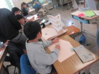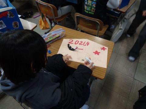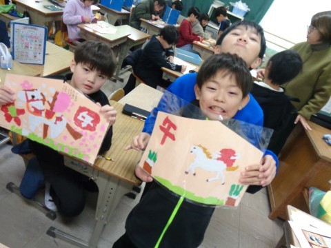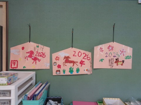 絵馬を作っています。完成した絵馬から、教室のうしろに掲示されています。