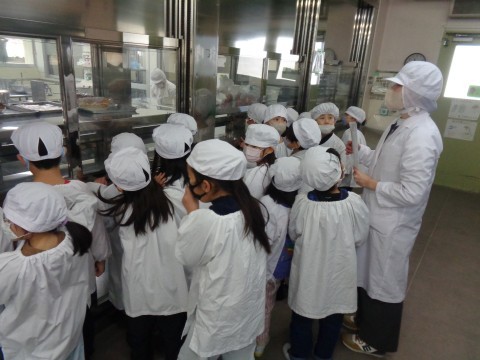 給食の先生が、2年生の子どもたちに調理場の様子を説明してくれています。