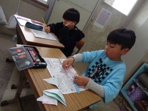 今日は、一人ひとり折り紙を使って分数について考えています。