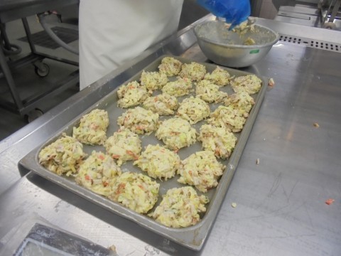お好み焼きは,1つ1つ成形して手作りしています!