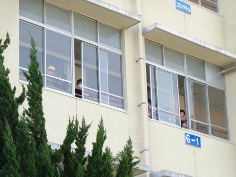 どこからか呼ばれる声が聞こえたので探してみると、今年、運動場が見える教室へ移ってきた6年生が3階の窓から声をかけてくれていました。ありがとうございます。