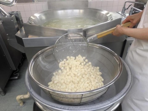 麻婆豆腐は、柔らかい豆腐がくずれないよう下ゆでしてから混ぜています。