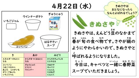 今日は、『きぬさや』や『新玉ねぎ』『キャベツ』など春が旬の野菜がたくさん登場しました。