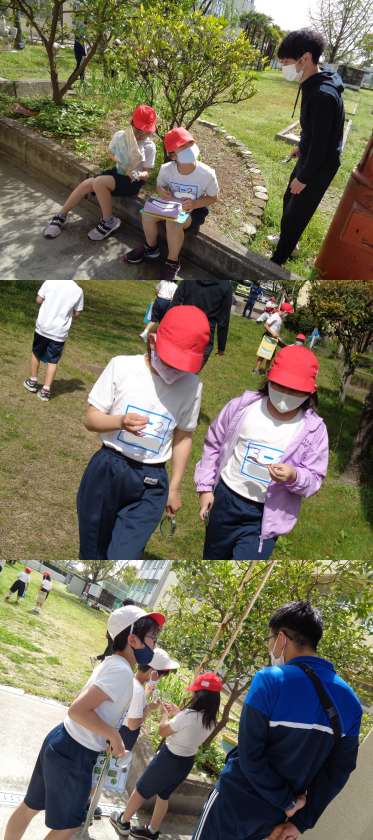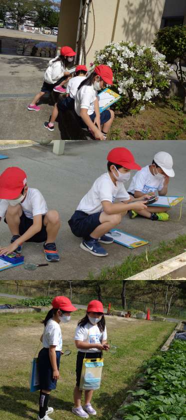 4月15日(木)3年生(2) 公開日 2021/04/15 更新日 2021/04/15 3年 春の生き物の観察のために,中庭に降りてきた2組の子どもたちです。 虫めがねで小さな虫を探したり,植物ではつつじなどを観察していました。