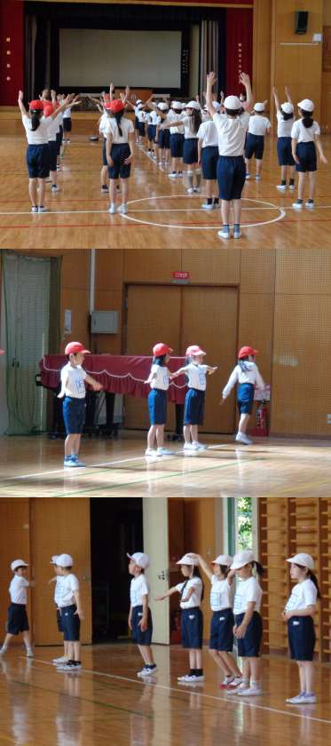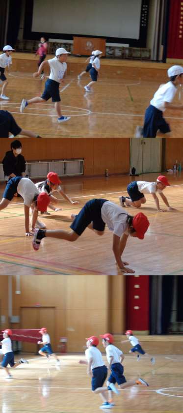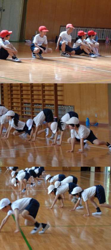 1組の体育です。 きっちりと整列し準備運動です。 体育館の端から端まで使い,体を動かしました。