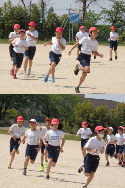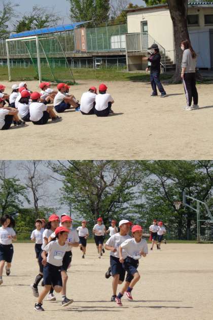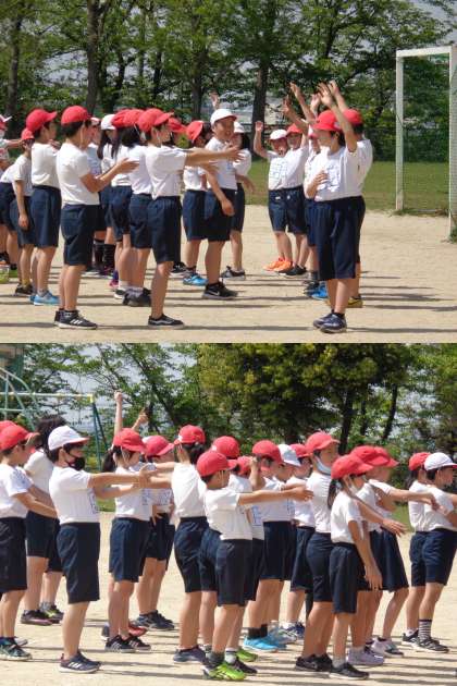 1組と2組の合同体育です。 授業の始まりに,まずは整列です。 係りの人が素早く行動しています。