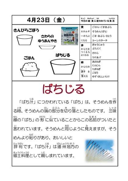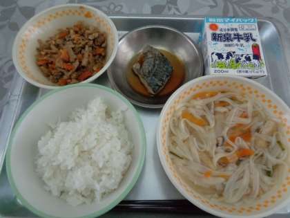 今日のメニューは ・ごはん ・牛乳 ・ばち汁 ・きんぴらごぼう ・さわらの幽庵焼 です。