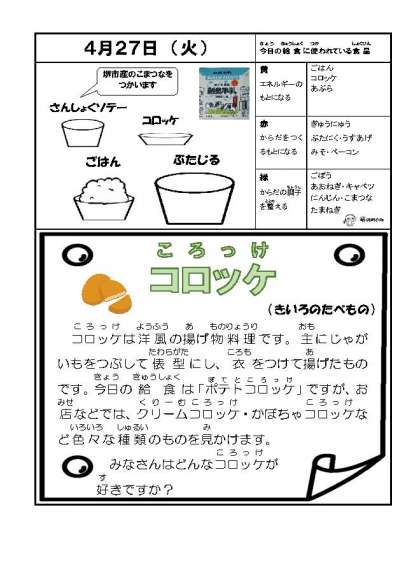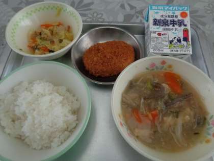 今日のメニューは ・ごはん ・牛乳 ・豚汁 ・コロッケ ・三色ソテー です。
