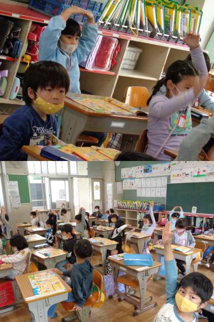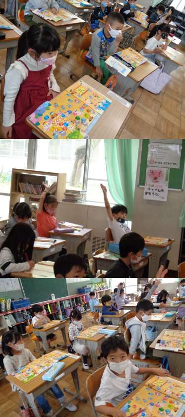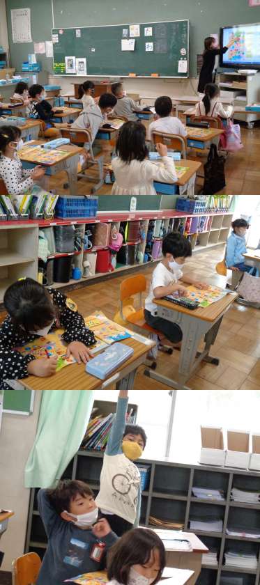 4月28日(水)1年生(2) 公開日 2021/04/28 更新日 2021/04/28 1年 3組もさんすうの授業です。 教室の大型テレビを使って数の確認をしました。 イラストを見てしっかり数えることができました。
