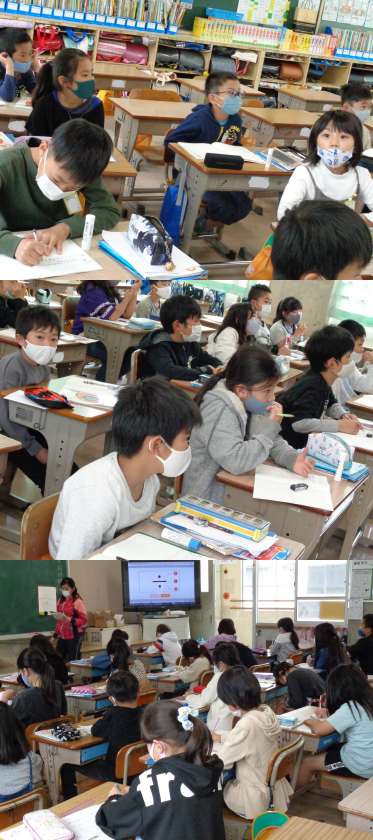 4月28日(水)3年生(2) 公開日 2021/04/28 更新日 2021/04/28 3年 今日は「12このおかしを4人で同じ数ずつ分けると,1人分は何こになるか」について,どんな分け方があるか考えました。