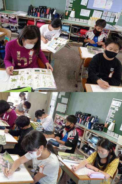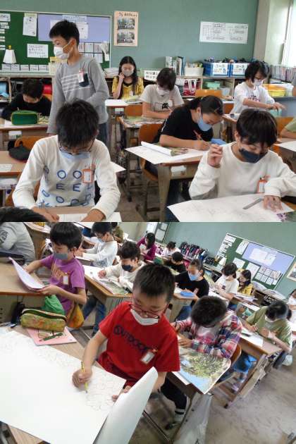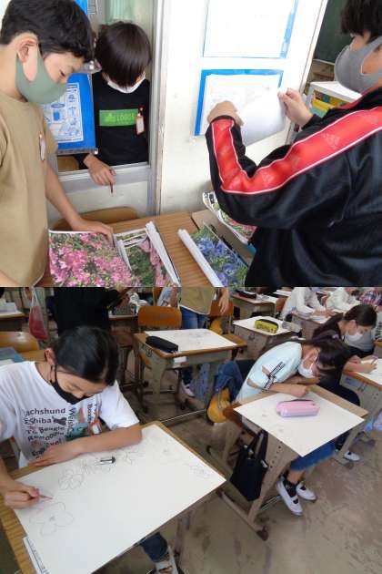 2組の図工の時間です。 ハナミズキやあじさいなどを描いています。