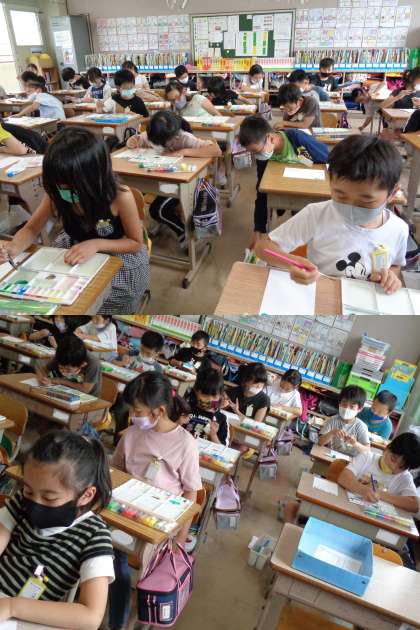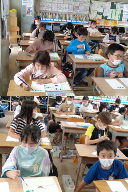 5月11日(火)3年生 公開日 2021/05/11 更新日 2021/05/11 3年 1組の図工の時間です。 「色と色が出会ったら・・・」と題して、2色ずつ慎重に混ぜていきました。 微妙な色の違いをうまく作り出している人が多かったです。