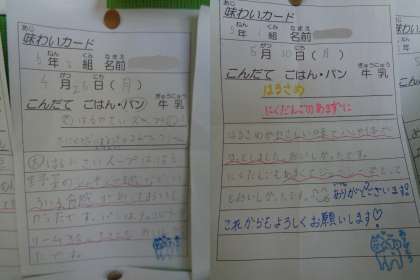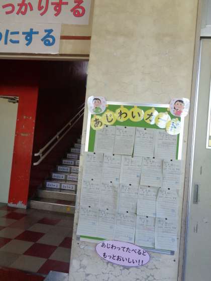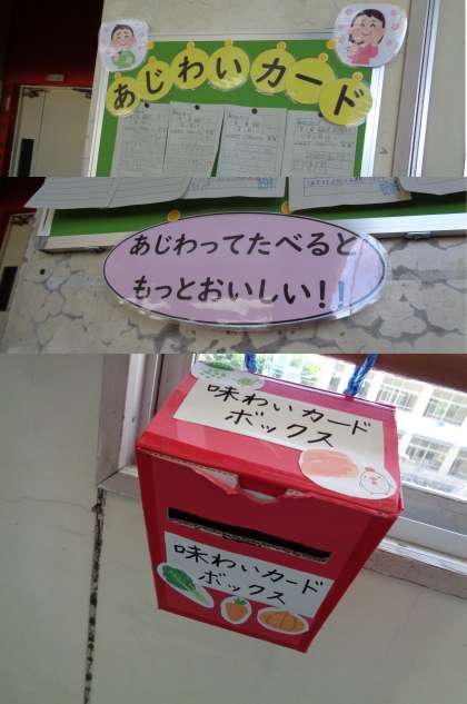 当日の給食の献立で「こういうところがおいしかった」等の気づきをカードに書いて、廊下のボックスに入れます。
