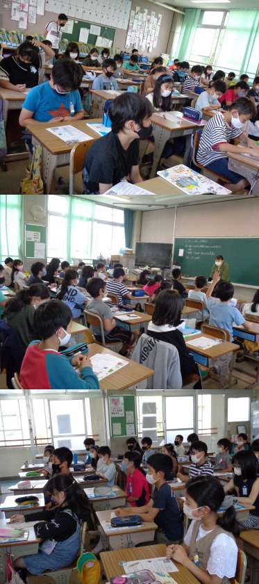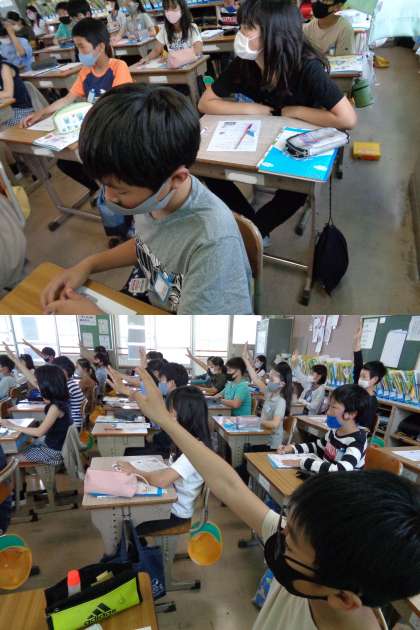 5月13日(木)5年生 公開日 2021/05/13 更新日 2021/05/13 5年 家庭科の授業「おいしい楽しい調理の力」です。 1組の今日は、ゆでる調理について学習しました。 包丁の使い方では、きき手側の足を一歩引いて立つと安定することなどを教わりました。