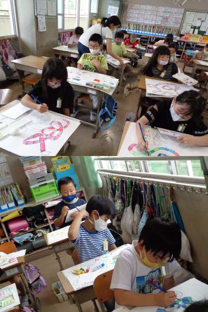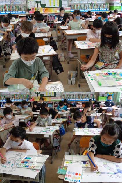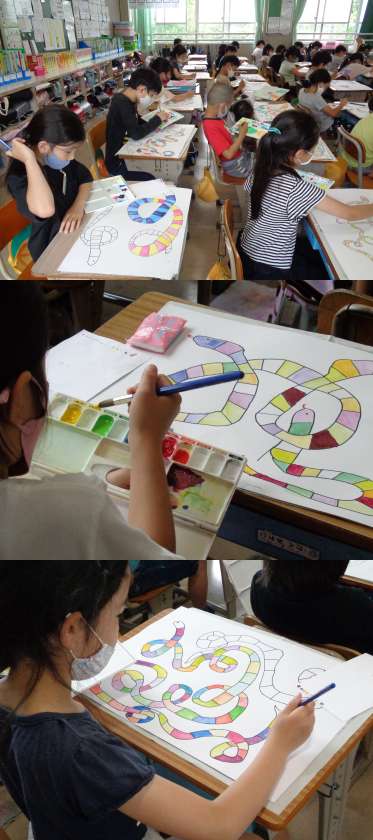 1組の図工です。 「カラフルなへびにしよう」というめあてで描いています。 きれいに仕上がったかな。