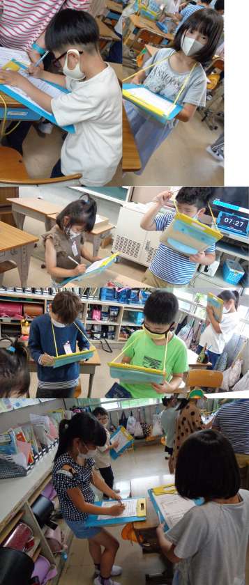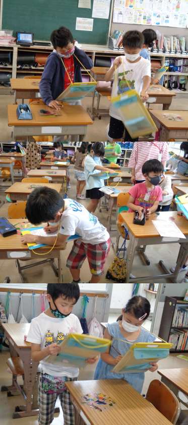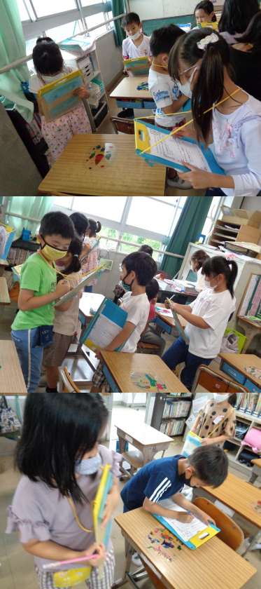 5月18日(火)2年生(2) 公開日 2021/05/18 更新日 2021/05/18 2年 1組,図工の時間です。 「ひかりのプレゼント」が完成しました。 今日はみんなで全員の作品を鑑賞して,「ほめほめカード」に記入しました。 「とってもきれいで賞」「すごくおもしろいで賞」を選び,理由も書いていました。