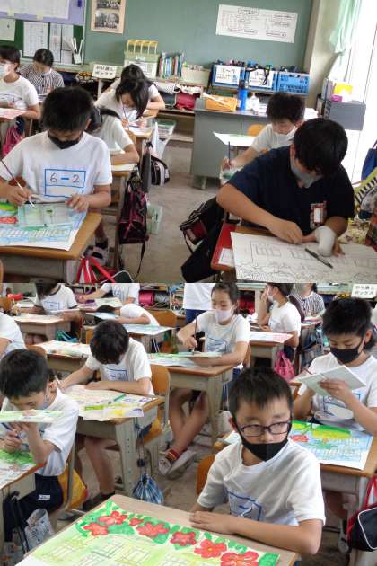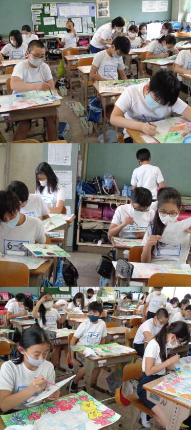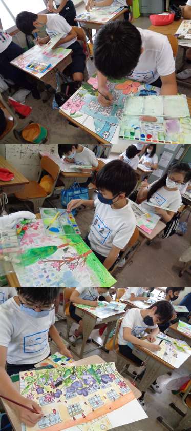 5月26日(水)6年生 公開日 2021/05/26 更新日 2021/05/26 6年 図工仕上げ週間です。 「花と緑の街」コンクールに出品する作品の仕上げに入りました。 見たところ,とても素晴らしい作品ばかりです。 写真は2組です。