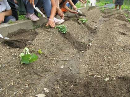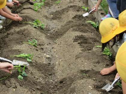 5月28日(金)2年生 公開日 2021/05/31 更新日 2021/05/31 2年 学習園にサツマイモの苗を植えに行きました。先生の説明を聞いてから,移植ごてを使って,順番に植えました。これからどのように育っていくのか楽しみですね。
