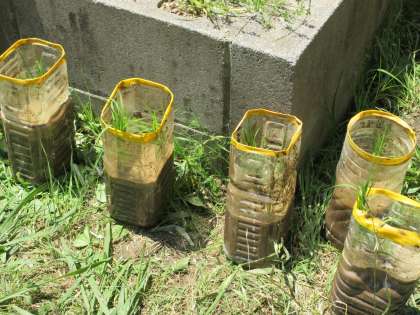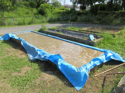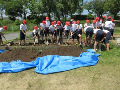 6月1日(火)5年生 公開日 2021/06/01 更新日 2021/06/01 5年 学習園に水田を作りました。土を掘り出してブルーシートを敷き,土を戻し入れて水を張りました。後は田植えを待つのみです。
