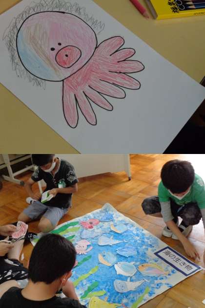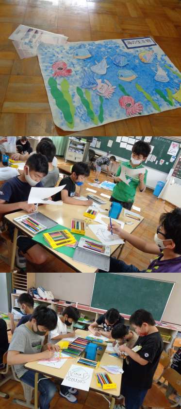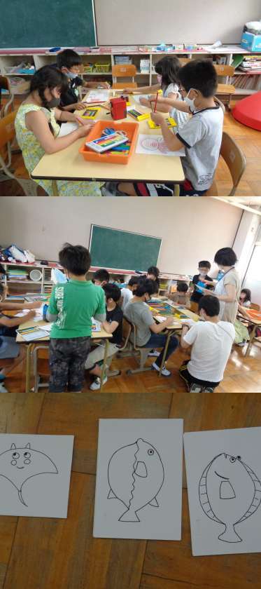 掲示用と「釣り遊び」用に使う“海の生き物”にきれいな色付けをしました。