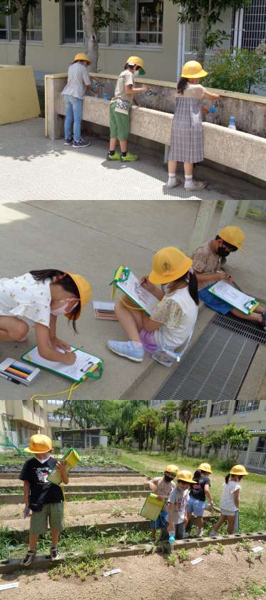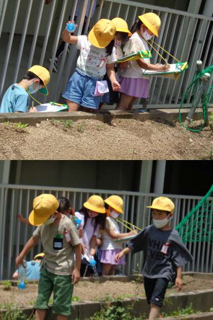 6月3日(木)1年生(1) 公開日 2021/06/03 更新日 2021/06/03 1年 学習園での活動の様子です。 ホウセンカやひまわり,マリーゴールドなどを観察し,「みつけたよ!」カードに観察した様子を記入していました。 あさがおにも水やりを忘れないようにしている1組の子どもたちです。