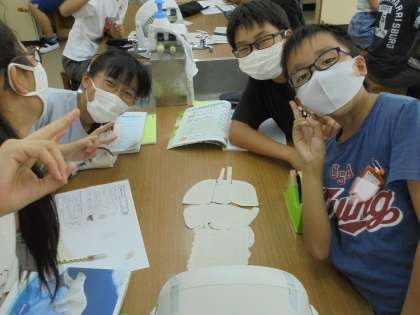 消化器官や呼吸器官をそれぞれ作った後で,組み合わせて一つの人体模型を完成させることができました。