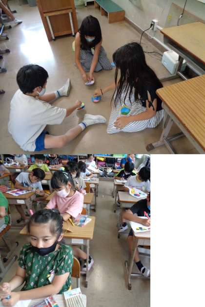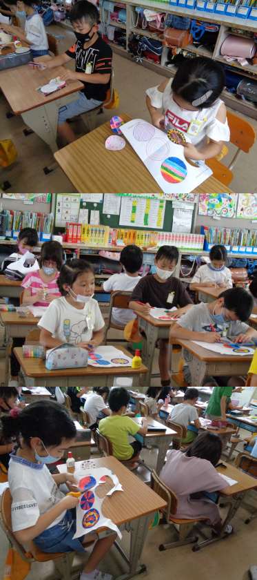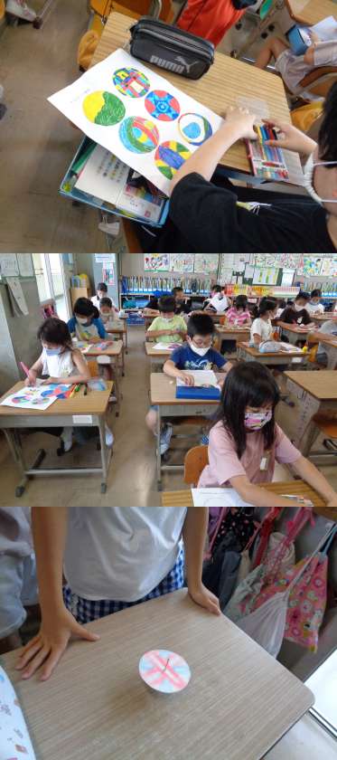 1組の図工です。 「きせかえコマ」を作り実際に回してみました。 色鮮やかな6種類のコマが出来上がりました。