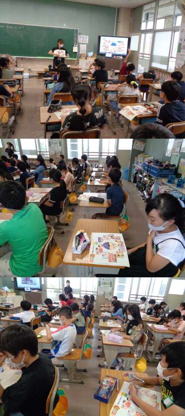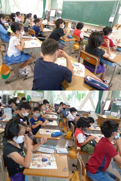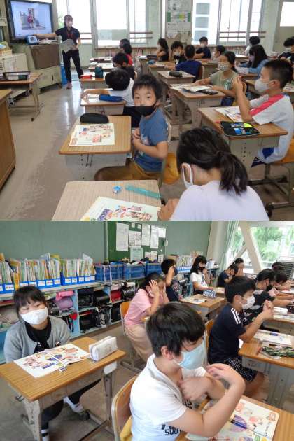 2組の外国語活動の様子です。 「What time is it?」の場面を学習していました。