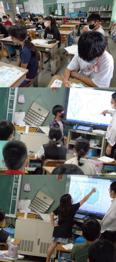 まずは「半径10cmの円の面積の求め方」を考えます。 子どもたちはいろいろな考え方を発表していました。