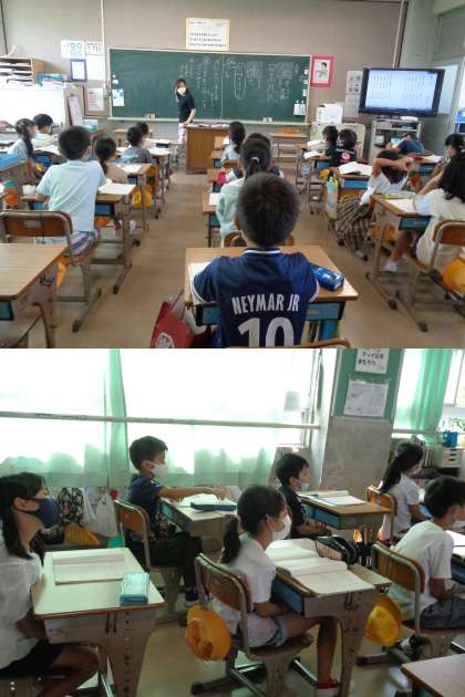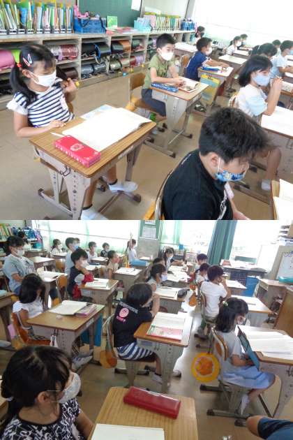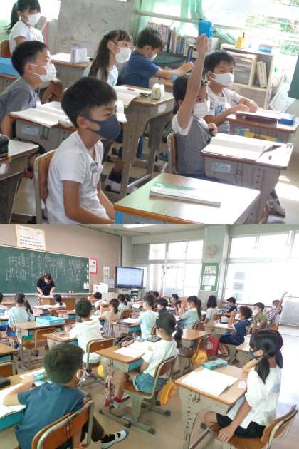 9月7日(火)2年生(1) 公開日 2021/09/07 更新日 2021/09/07 2年 「雨のうた」を学習した後,自分でもう一行「詩」を作ります。 その前に雨に関係する音(オノマトペ)について考えました。