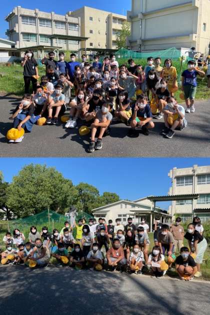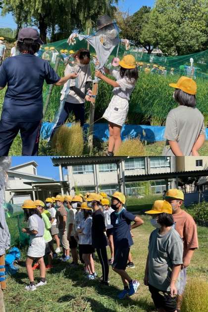 9月10日(金)5年生(2) 公開日 2021/09/10 更新日 2021/09/10 5年 1組も2組も立派なかかしが完成しましたね。光るものを付けたりと工夫もバッチリです。最後はクラスごとで記念撮影を行いました。