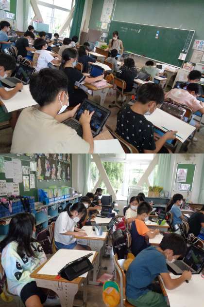 タブレットの写真や本物のへちまを見ながら,丁寧に描いている2組の子どもたちです。